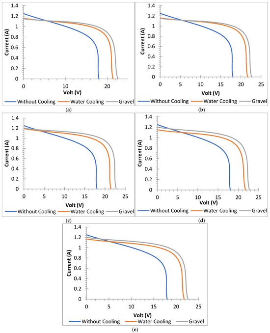 - I–V curve analysis revealed notable enhancements in short-circuit current (Isc) and open-circuit voltage (Voc). The PoM cooling system outperformed both passive and water-cooling methods by significantly increasing Isc and Voc, leading to improved I–V characteristics and greater power output.