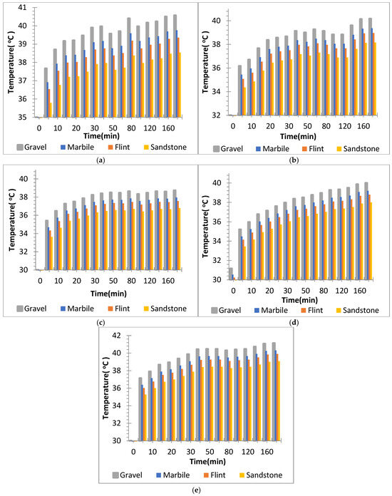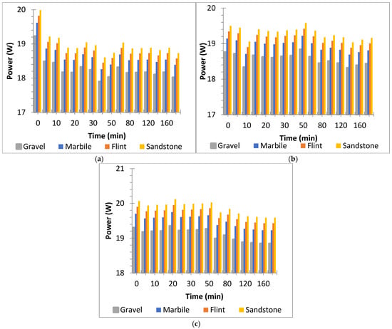 In addition to performance evaluation, the long-term behavior of the PoM, gravel, marble, flint, and sandstone, was carefully monitored during repeated thermal cycles and continuous water exposure. These materials exhibited high mechanical hardness, which contributed to their resistance against thermal stress, erosion, and structural degradation. Their granular structure, composed of relatively large particles, also helped prevent sediment buildup and clogging. Throughout the experimental period, no flow restrictions or material deterioration were observed, confirming the durability and reliability of these media for extended use in PV thermal regulation systems.