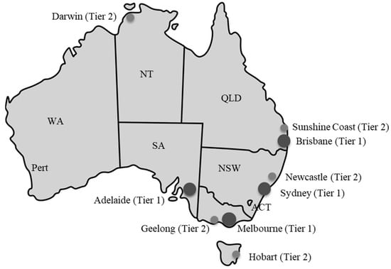 Figure 2 provides an overview of the selected Tier 1 and Tier 2 urban centres across Australia, while Figure 1 illustrates the country’s three-tiered governance system, emphasising the roles of federal, state/territory, and local councils in shaping smart city initiatives [7]. Prior research noted that smaller cities, despite their resource constraints, can serve as “innovation labs”, rapidly implementing targeted pilot projects that are sometimes overlooked in large-scale metropolitan plans [10]. However, there remains limited empirical analysis of how these smaller (Tier 2) contexts can effectively utilise smart technologies for resilience and how their approaches differ from the more complex, better-funded Tier 1 systems.