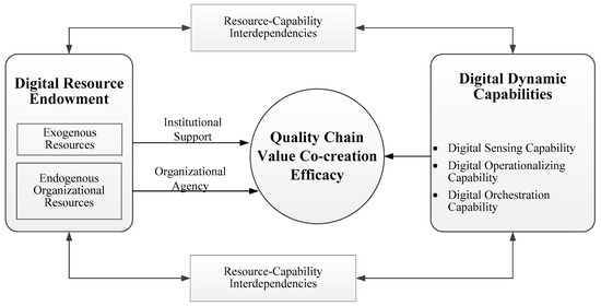 Drawing upon resource-based and dynamic capability theories, and contextualized within quality chain system practices, this study categorizes the factors influencing quality chain value co-creation efficiency into resource-based factors and digital dynamic capabilities. Resource-based factors are delineated into the two following antecedent variables: exogenous and internal resources. Digital dynamic capabilities comprise the three following three antecedents: digital perception, operation, and collaboration capabilities. The analytical framework of this study is illustrated in Figure 1.