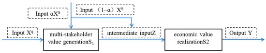 The shared-input two-stage network DEA model is a methodology for evaluating the relative efficiency of decision-making units (DMUs) that allocate input resources across sequential stages [79]. This framework comprises the following two distinct phases: the first generates intermediate outputs from shared inputs, while the second utilizes these intermediates for subsequent processing. In the initial stage, DMUs convert input resources into intermediate outputs, whilst the second stage applies these outputs to final production [80]. By decoupling these processes, the structure enables the precise measurement of stage-specific efficiency. Consequently, aligned with the operational dynamics of quality chains, this study adopts the shared-input network DEA model to assess value co-creation efficiency.