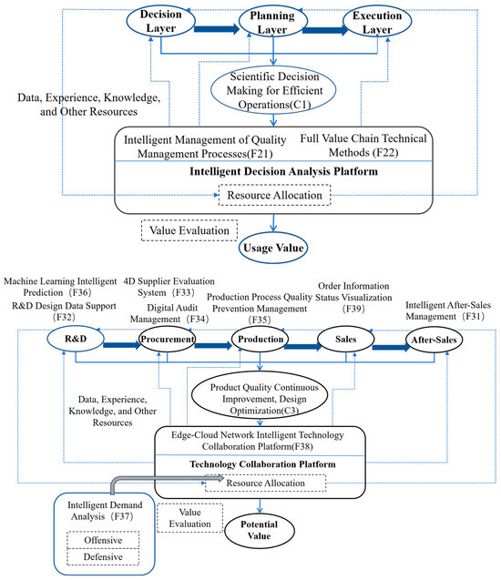 (1) Internal horizontal integration (intra-departmental coordination): Lenovo advocates digitalization to enhance quality management by enabling efficient operational processes and data-driven decision-making. Guided by the principles of process integration, data standardization, and quality-driven business value, Lenovo employs mathematical analysis, machine learning, and operational modeling to develop intelligent solutions. The vertical value proposition, manifested as operational efficiency and scientific decision-making (C11), serves as the foundation of value co-creation. Underpinned by the PDCA (plan–do–check–act) framework, Lenovo’s management–executive layer has developed intelligent systems that utilize advanced data analytics to facilitate decision-making. Lenovo’s value co-creation framework mitigates collaboration inconsistencies via a resource-integration coordination mechanism [92], addressing decision-making inefficiencies stemming from fragmented stakeholder alignment.