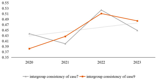 Necessary condition analysis is judged by a consistency level higher than 0.9, which means that the condition is considered necessary to constitute the outcome variable. In QCA panel data analysis, when the adjustment distance is less than 0.1 the aggregated consistency accuracy is high and can be used as a basis for judgment. However, when the adjustment distance is greater than 0.1, it is necessary for the researcher to further explore the necessity. The results of the analysis are shown in Table 6. The adjustment distance of the three conditional variables of digital collaboration capabilities, digital perception capabilities, and digital operation capabilities in the three phases is less than 0.1, and the aggregated consistency is less than 0.9, which indicates that these factors are not the necessary conditions for the outcome variables. However, government support and digital construction investment have intergroup adjustment distances greater than 0.1, which need to be further examined. By analyzing the intergroup consistency and coverage of the corresponding variables (as shown in Table 7), this study finds that none of the years in combinations 1 to 9 have a level of intergroup consistency greater than 0.9 and an intergroup coverage greater than 0.5, and therefore concludes that none of the conditions constitutes a necessary condition for the efficiency of quality chain value co-creation over the overall time. It is also worth noting that the consistency of government support and digital construction input elements in cases 7 and 9 shows an increasing trend from 2020 to 2023 (as shown in Figure 5), in which the degree of the necessity effect of digital construction input increases most rapidly, which coincides with the results of the previous study, and to a certain extent demonstrates the importance of digital construction input. With the passage of time, the manufacturing industry needs to complete the digital transformation, and so the demand for digital inputs for enterprises is also climbing rapidly.