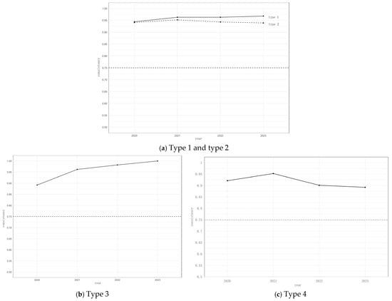 All four types exhibited intergroup consistency adjusted distances < 0.1 [113], indicating no significant temporal effects. However, consistency levels fluctuated above 0.75 during 2020–2023, with a notable dip in 2021 (Figure 6). This non-random anomaly (2021–2023) likely reflects COVID-19 disruptions to manufacturing operations in Beijing. Systemic shocks to supply chain coordination and multi-stakeholder value co-creation attenuated conventional causal explanations [114]. Nevertheless, adjusted distances < 0.1 across configurations preserve analytical robustness, affirming the model’s generalizability [112].