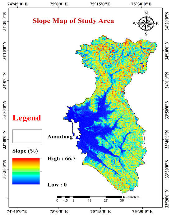 This research was conducted in Anantnag, the southernmost district of Kashmir province. Notable springs include Verinag Spring, Kokernag Spring, Achabal Spring, Lukhbawan Spring, Martand Spring, Malakhnag Spring, and Sherbagh Spring. It is located between 75°03′30″–75°19′29″ E longitude and 33°31′07″–33°54′30″ N latitude, covering an area of approximately 402 km2 (Figure 1). The population of the district, as per census 2011, is 1,078,692 individuals, comprising 153,640 households [28]. The research area ranges in elevation from 1591 to 2708 m above mean sea level (MSL) and experiences a moderate climate with an average annual precipitation of 1240 mm [29]. The district lies within the Jhelum sub-basin of the Indus basin, with the Jhelum River originating from Verinag and branching into the Lidder, Vishav, and Sangarn rivers. The elevation of the spring shed ranges from 1560 to 4398 m above mean sea level. The slopes surrounding the springs exhibit a range from gentle to steep gradients. Verinag and Kokernag, situated in mountainous locations, feature moderate to steep slopes and are described by slope maps (Figure 2). The climate is most likely classified under the Cfb (oceanic climate) or Cwa (humid subtropical climate) at lower elevations, and Dfb (warm-summer continental climate) or Dfc (subarctic climate) in higher altitudes, based on moderate temperatures, significant monsoon rainfall, and seasonal temperature variations. The soils include alluvial soils in valley plains [30], ideal for crops like rice and wheat; Karewa soils, rich in clay and silt, perfect for saffron and horticulture; and mountain soils in higher altitudes, supporting forests and alpine vegetation.
