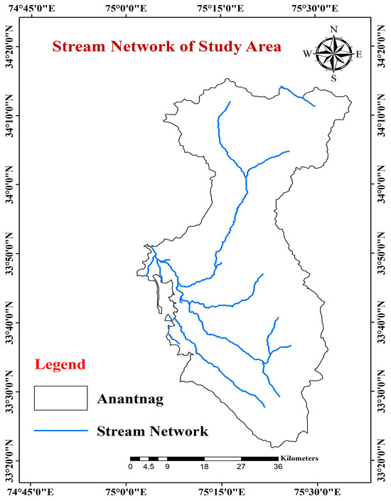 Stream network of the study area displays the stream network of the study area, illustrating the spatial distribution and connectivity of streams and watercourses within the region.