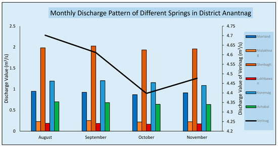 Monthly discharge patterns of various springs in District Anantnag from August to November, showing comparative discharge values (m3/s) for Martand, Malakhnag, Sherbagh, Lukhbawan, Korenag, Achabal, and Verinag Springs, with a distinct trend for Verinag Spring overlaid.