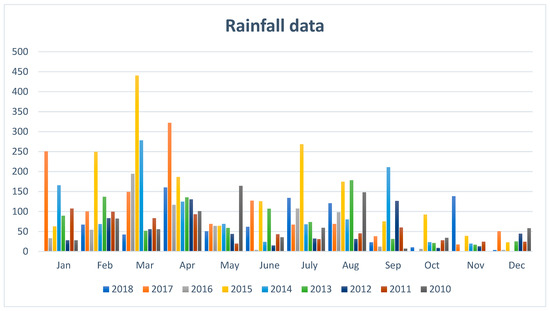The graph presents the monthly rainfall data [39] for the years 2010 to 2018 in the study area, highlighting significant temporal and inter-annual variations. Key observations include the following: