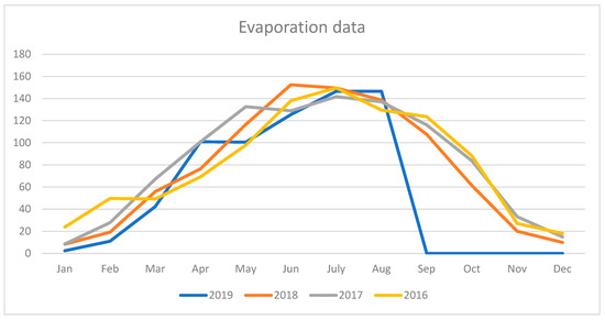 The graph illustrates monthly evaporation [39] trends for the years 2016, 2017, 2018, and 2019 in the study area, highlighting key seasonal and inter-annual variations. Evaporation rates exhibit clear seasonal trends, consistently rising from January and peaking during the summer months (June–July) when temperatures are at their highest before gradually declining towards the end of the year. Across all years, evaporation rates are minimal from November to February, corresponding to reduced temperatures and lower solar radiation levels. Inter-annual variability is also evident, with 2016 recording the highest summer evaporation rates, likely reflecting hotter and drier climatic conditions. Both 2017 and 2018 followed similar seasonal patterns, characterized by moderate summer evaporation peaks. In contrast, 2019 showed an unusual sharp decline in evaporation after July, potentially due to early monsoons, increased cloud cover, or other climatic anomalies.