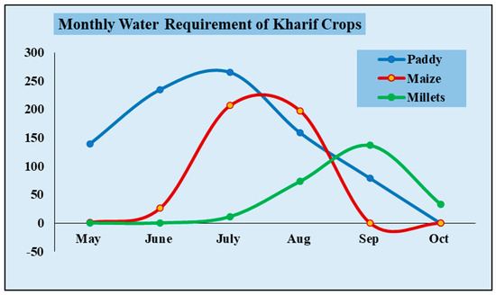 Monthly water requirement (mm) of Kharif crops (paddy, maize, and millets) from May to October, indicating a variation in peaks from July to September.