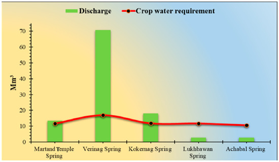 For maize, which has a significant water requirement of 206.65 mm in July [49], Verinag Spring, Kokernag Spring, and Martand Temple Spring are all capable of meeting these demands due to their respective discharge rates and consistent water flow. Verinag Spring, with its abundant discharge, ensures ample water supply for maize crops during their peak requirement period. Millets, with a peak water requirement of 136.65 mm in September, also benefit from the consistent flow of Verinag Spring, Kokernag Spring, and Martand Temple Spring, ensuring sustained water availability into the early autumn months. Figure 15 illustrates the relationship between the discharge rates of springs and the corresponding crop water requirements, highlighting the critical role of reliable spring discharge in meeting agricultural water needs throughout the year.