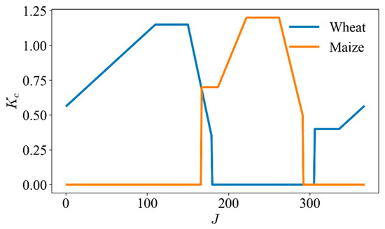 where denotes the number of days in a year between 1 (1 January) and 365 or 366 (31 December); denotes crop coefficient at day ; denotes the daily crop evapotranspiration at day (mm d−1), calculated using the FAO-recommended Penman–Monteith formula [19,20]. Figure 1 illustrates temporal variations in for wheat and maize as representative crops. Detailed computational procedures are provided in Appendix A.