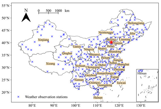 Meteorological data, obtained from the Global Hourly-Integrated Surface Database (ISD) at NCEI (https://www.ncei.noaa.gov/pub/data/noaa/isd-lite/, accessed on 14 May 2024), including weather station hourly observations such as (air temperature), (dewpoint temperature), (wind speed rate), (sky condition total coverage), and (precipitation), as well as the station basic information such as (altitude) and (latitude). Due to the possibility that data from certain stations may not span the entire year, stations with at least 340 days of coverage annually were selected for each province, as illustrated in Figure 2.