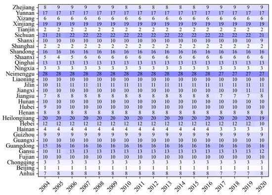 Irrigation-carbon-emission efficiency for each province from 2004 to 2020.