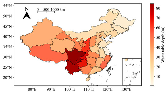 Another important data used in the carbon emission calculation is , the lift of groundwater to surface for irrigation, also referring to groundwater table depth (Table 2). The groundwater table is assumed to be the same all the time, and for each province, was calculated by averaging the global groundwater GIS data [29] (Figure 4).
