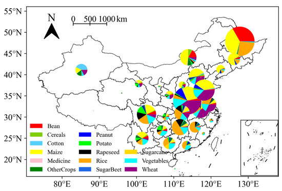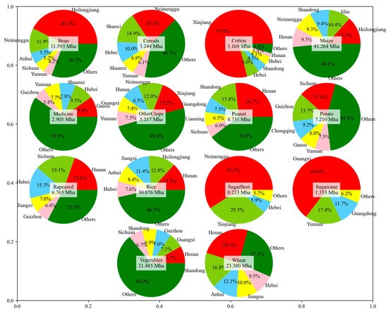 According to Figure 5, the production of certain crops is primarily concentrated within one or several provinces. For example, 83.2% of cotton is planted in Xinjiang, while 53.5% of beans are planted in Heilongjiang and Neimenggu, and 53.3% of wheat is planted in Henan, Shandong, and Anhui. However, some crops, such as maize, rice, and vegetables, exhibit a more even distribution across the country and dominate in planting areas. Figure 6 shows the proportions of crop planting area in each province, where the size of the pie corresponds to the relative size of the planting area. It reveals that the top three provinces with largest planting are Henan, Heilongjiang, and Shandong. Furthermore, most of the maize (yellow parts in the pies) is planted in North China, while most of the wheat (orange parts in pies) is planted in the central part of China, and most of the rice (purple parts in pies) is planted in South China. In general, the majority of the crops are planted in the eastern region of China.