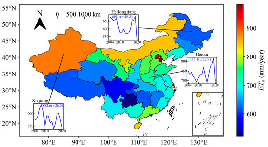 Figure 7 shows the provincial-level distribution of mean annual reference evapotranspiration () across the country during the period from 2004 to 2020. In comparison to Figure 6, it becomes evident that crops generally prefer lower overall. It can be observed that is higher in North China and the very south of China, where radiation levels are elevated or humidity levels are reduced. The smaller subfigures depict the temporal evolution of from 2004 to 2020. Despite the presence of fluctuations in the changing trend of over the years, the variance remains relatively small when compared to the overall value. Therefore, the mean annual between 2004 and 2020, as colored in Figure 7, would be subsequently utilized for estimating the of each crop.