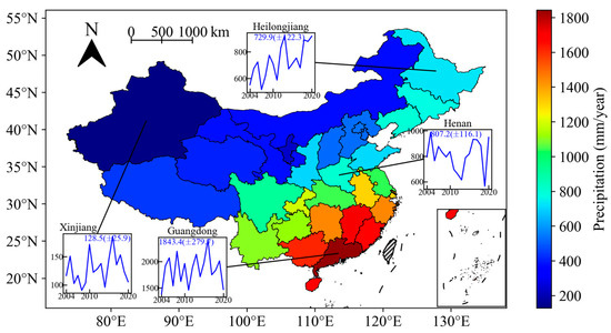 Provincial distribution of time-averaged annual precipitation during 2004–2020.