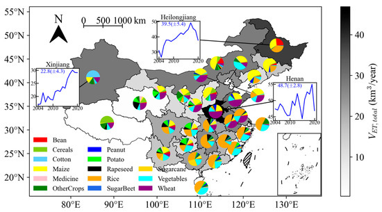 As mentioned in Section 2.1, the estimation of the precise crop water requirement within a province should include as many crops as possible. Figure 9 shows the provincial-level distribution of annual crop water requirement () and its proportions for different crops in 2020. Based on the year-to-year results, it can be observed that Henan province has the largest of 48.7 (±2.8) km3/a, accounting for 9.1 (±0.3)% of the total in China, followed by Heilongjiang with 39.5 (±5.4) km3/a, Shandong with 36.1 (±2.1) km3/a, Anhui with 31.8 (±2.4) km3/a, Hunan with 28.8 (±2.7) km3/a, Hebei with 28.6 (±1.4) km3/a, and so forth. However, as shown in Figure 9, Xinjiang province stands out as a special case, with its increasing by 72.5% from 2004 to 2020, accounting for 5.9% of the total in China in 2020, ranking 4th. The variance trend of in Xinjiang is consistent with its total crop planting area, which increased by 80.0% from 2004 to 2020, accounting for 3.7% of that in China in 2020.
