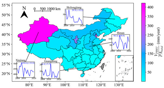 Figure 8 illustrates the annual average precipitation of each province in China over the period from 2004 to 2020. The spatial distribution trend of precipitation is quite straightforward, with annual precipitation increasing from Northwest China to Southeast China. Specifically, Guangdong province has the highest annual average precipitation of 1843.4 (±279.7) mm/a, whereas Xinjiang province has the lowest annual average precipitation of 128.5 (±25.9) mm/a. It should be noted that both the evapotranspiration presented in Figure 7 and the precipitation presented in Figure 8 refer to the accumulated values over a whole year. It can also be observed that the precipitation has a higher year-to-year variation compared to the evapotranspiration. Based on the annual average data, most provinces in Northwest China exhibit lower precipitation levels than the reference evapotranspiration, which may, however, vary in specific years.