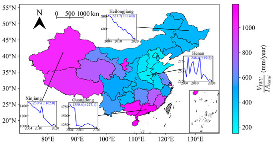 is calculated by the effective evapotranspiration, while is derived from the difference between effective evapotranspiration and effective precipitation. The potential irrigation water use intensity (), as depicted in Figure 10, is computed for comparison with the in Figure 7 and the precipitation in Figure 8. here represents the total planting area. It should be noted that is associated with the crop proportions but remains independent of agricultural irrigation practices. As shown in Figure 10, Xinjiang (421.7 mm/a), Tianjin (266.0 mm/a), and Ningxia (220.7 mm/a) are the top three provinces with the highest in 2020. It can also be observed that most provinces in South China exhibit a lower than 50 mm/a.