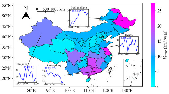 Based on Equation (7), the water-saving potential is derived by the difference between and . According to the year-to-year results, the annual average for the whole of China is 564.7 (±16.0) km3/a during the period from 2004 to 2020. As shown in Figure 12, in the year of 2020, Heilongjiang has the highest of 27.4 km3/a, which is followed by Jiangsu (24.7 km3/a), Guangdong (20.7 km3/a), Hunan (19.6 km3/a), Guangxi (18.3 km3/a), Jiangxi (16.2 km3/a), and so forth.