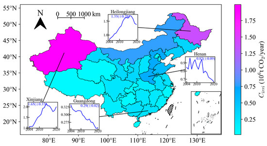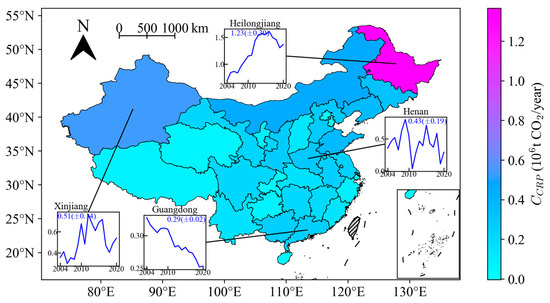 represents the annual carbon emission due to irrigation. The for the whole of China decreased by 3.2% to 10.4 Mt CO2/a during the period from 2004 to 2020. Figure 13 shows the provincial-level distribution of in 2020. It can be observed that Xinjiang province has the highest of 1.99 Mt CO2/a in 2020. This is followed by Heilongjiang (1.38 Mt CO2/a), Neimenggu (0.77 Mt CO2/a), Hebei (0.69 Mt CO2/a), Henan (0.67 Mt CO2/a), Shandong (0.55 Mt CO2/a), and so forth. Overall, turns out to be much higher in North China. According to the year-to-year results, the top five provinces experiencing an increase in from 2004 to 2020 are Xinjiang (by 90.2%), Heilongjiang (by 63.3%), Xizang (by 61.3%), Chongqing (by 32.1%), and Anhui (by 30.0%). These are the only provinces that exhibited an increase in over this period. Conversely, the top three provinces with a decrease in are Beijing (by 86.2%), Hebei (by 51.3%), and Tianjin (by 50.0%).