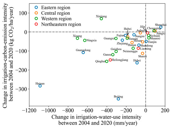 Figure 15 shows the changes in irrigation-carbon-emission intensity () and irrigation-water-use intensity () for the four regions between 2004 and 2020. It can be observed that the increase in over the past two decades has directly resulted in the decline of the water used for irrigation, as well as a reduction in the carbon-emission associated with irrigation. However, Xinjiang province, which has the highest in China, experienced a notable increase of 20.8% in from 2004 to 2020. The increase can be primarily attributed to the rapid adoption of water-saving irrigation technologies in Xinjiang. From 2004 to 2020, in Xinjiang rose from 60.83% to 88.56%, especially with the micro-irrigation area undergoing a 12.66-fold expansion over the period. On the other hand, Heilongjiang province, which has the second highest in China, experienced a remarkable decrease of 39.6% in from 2004 to 2020. Although the absolute decline of in Xinjiang (457.0 mm/a) is slightly larger than that in Heilongjiang (365.3 mm/a), the relative change in Xinjiang (−31.1%) is smaller than that in Heilongjiang (−44.7%).