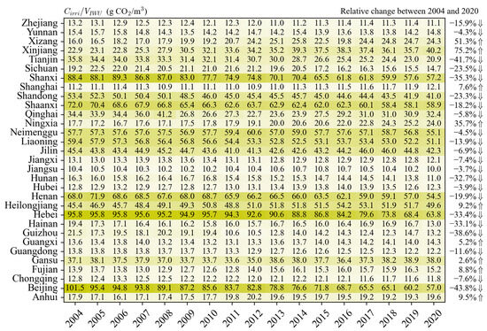 In order to further analyze the relationship between carbon-emission and water-use, the concept of irrigation-carbon-emission efficiency is defined as (g CO2/m3), as shown in Figure 16, which illustrates the year-to-year trend of from 2004 to 2020. It can be observed that has increased in 9 out of the 31 provinces during this period. Specifically, Xinjiang province has the largest percentage increase in with 75.2%, while Heilongjiang shows an increase percentage of 9.2%. Further investigation into the provincial year-to-year data revealed that has a strong positive linear relationship with (Pearson correlation coefficient = 0.981), which represents the ratio of groundwater utilized for irrigation purposes.