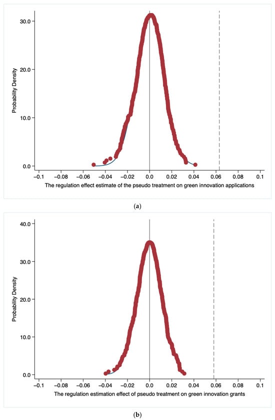 Besides the governmental policies noted above, unobservable factors may also influence the relationship between the pay cap regulation and firm innovation. Following [71], we used a placebo test to evaluate the robustness of our results. We generated a placebo treatment by randomly reassigning the observations in our sample to the treatment and control groups and re-estimated the baseline model specified in Equation (1). We replicated the procedure 1000 times and stored the estimated coefficients of interest. The distribution of the coefficients is shown in Figure 1a,b. For example, Figure 1a shows that the average coefficients were around 0 for the number of green patent applications as the dependent variable. Figure 1b shows a similar pattern for the number of granted green patents as the dependent variable. Thus, the results of the placebo test rule out the possibility that other, unobservable factors drive the relationship between the pay cap regulation and green innovation, suggesting that our main results are reliable.