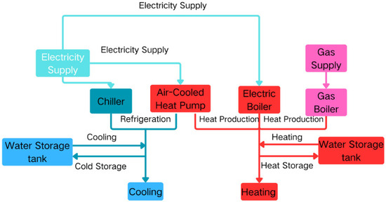 Eastern China is constructing a southern energy corridor to establish sustainable integrated energy systems. This initiative creates a low-carbon energy innovation system in the Yangtze River Delta region with high clean energy self-sufficiency. The project supports China’s national goal of building a robust energy center in central and eastern regions while facilitating the regional energy structure transition [20]. Regional integrated energy companies are promoting centralized energy stations in development zones, focusing on zero-carbon and low-carbon solutions. These stations use environmentally friendly technologies, green building standards, and digital systems for enhanced efficiency. The goal is to achieve zero-carbon solutions, improve energy utilization efficiency, and support integrated energy services [21]. Internationally, various approaches to regional energy systems have been developed based on local conditions. In the United Kingdom, wind power has become a major component of renewable energy generation, reflecting the country’s abundant wind resources and commitment to reducing carbon emissions [22]. In China, regional approaches to energy systems vary significantly by climate zone. In cold regions, the three most common heating methods include combined heat and power (CHP), boiler heating, and innovative ground-source heat pump systems [23]. In regions with hot summers and cold winters, areas with cooling and heating demands typically employ chilled water units combined with thermal energy storage; locations with low gas prices or subsidies often utilize combined cooling, heating, and power (CCHP) systems, while areas with high gas prices generally prefer heat pump systems for heating needs. Krause T clarified the concept of integrated energy systems, defining them as energy systems that achieve deep integration and close interaction among sources, networks, and loads [24]. Sahin C conducted an in-depth analysis of the interactions between the natural gas and power systems in the United States, covering topics such as the impact of natural gas price fluctuations and pipeline failures on power security, power generation unit optimization considering natural gas pipeline operational constraints, power risk assessment, and the coordinated optimization of gas and power systems [25]. The German RegModHarz project coordinates wind energy, solar energy, biomass energy, and pumped storage power stations, striving for the optimal cyclic utilization of renewable energy. The American energy management company OPower differs from other comprehensive energy service providers by not directly interacting with users. Instead, it sells cloud computing software to power companies, offering demand-side data to help them analyze consumer behavior and provide energy usage recommendations, thereby enhancing the marketing service level of these power companies. The business model of Japan’s Tokyo Electric Power Company involves segmenting users into large-scale users and residential users, providing targeted services based on their needs. In addition, the company offers solutions, equipment maintenance, energy-saving diagnostics, and operational management for energy conservation services. In regions characterized by hot summers and warm winters, where cooling is the primary year-round demand, mainstream regional energy systems predominantly use chilled water units integrated with ice storage systems [26]. Resource assessments conducted in Eastern China reveal that electricity is abundant, with a standardized 10 kV electricity pricing structure throughout the region that implements time-of-use rates. Summer peak, standard, and off-peak rates are 0.916, 0.567, and 0.213 CNY/kWh respectively, creating a peak-to-valley price differential of approximately four times. This pricing structure makes thermal energy storage technologies particularly advantageous, as they can both reduce peak demands on the power grid and significantly lower operational and regional energy supply costs [27]. Natural gas is primarily delivered through pipeline infrastructure with season-dependent pricing—4.02 CNY/Nm3 during winter months and 3.82 CNY/Nm3 during non-winter periods—without any discounts for distributed natural gas supply [28]. From an environmental perspective, the electricity emission factor is 0.42 kg CO2/kWh [29], while the natural gas emission factor is 21.84 t CO2 per 10,000 Nm3 [30]. By synthesizing domestic and international best practices with local resource conditions, Eastern China has strategically chosen to implement an electricity-cantered energy system complemented by thermal energy storage technologies, ultimately developing a low-carbon all-electric energy station supply scheme that aligns with both economic considerations and environmental objectives.