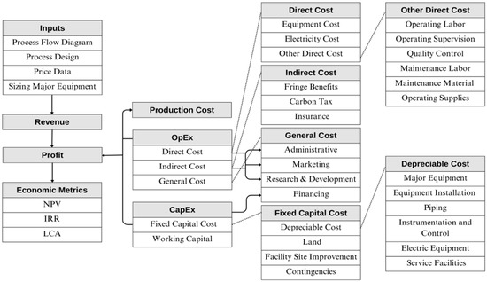 While the systematic enumeration of steps required for system creation provides valuable insights into technical performance from a design perspective, the analysis of costs and revenues simultaneously enables rigorous evaluation of economic performance. Economic assessments typically incorporate time value of money calculations and generate critical performance indicators such as payback period and return on investment metrics. To enhance decision-making capabilities, the assessment framework often includes sensitivity and uncertainty analyses that account for potential variations in prices, revenues, and other influential factors. Figure 2 presents the comprehensive TEA framework implemented in this study (adapted from reference [30]).