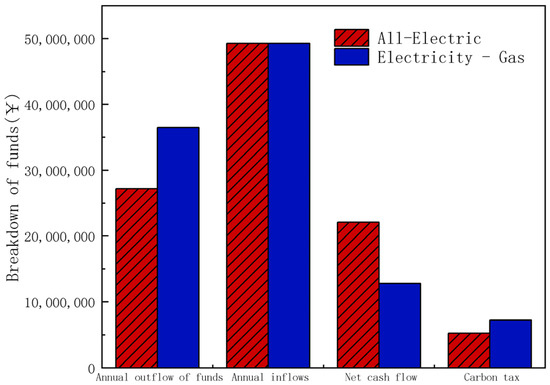 To provide a clearer comparison, Figure 4 illustrates the financial inflows and outflows for both the all-electric and electricity-gas energy systems. As shown in the figure, the all-electric energy station has lower financial outflows, resulting in a significantly higher net cash flow compared to the electricity-gas system.