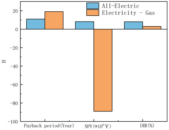 Figure 5 provides a visual comparison of the economic outcomes between the all-electric and electricity-gas energy systems. The shorter payback period, positive NPV, and higher IRR of the all-electric energy station clearly demonstrate its superior economic performance.