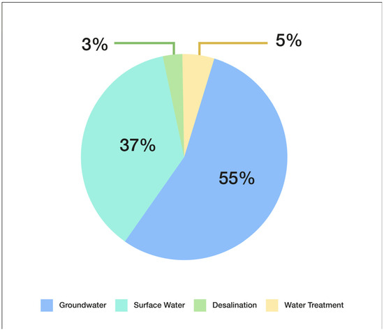 On the other hand, analyzing the maximum water allocations in the studied sub-basin, according to the Hydrological Plan in force [26], at the beginning of the planning period of 2022–2027, we obtain the distribution from Table 1, in which 71% of the allocated resource is of groundwater origin, 25% surface, 3% from desalination and the remaining 1% from wastewater treatment: