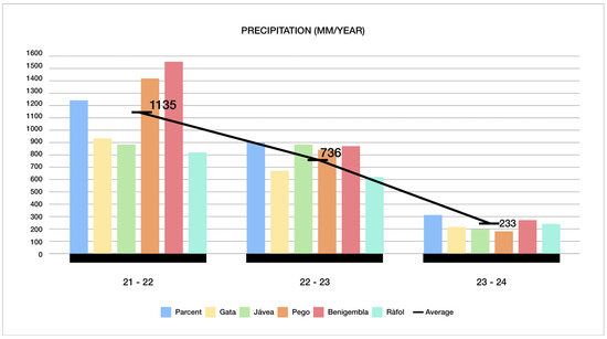 Annual precipitation in La Marina Alta district during hydrological years 2021–2022, 2022–2023 and 2023–2024. Source: own elaboration from AVAMET [33].