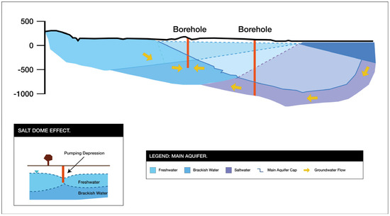 As shown before, there are municipalities that rely almost entirely on groundwater for their water supply, which has subjected the aquifers to intense overexploitation, causing high-conductivity scenarios due to marine intrusion [35]. Figure 3 shows the saline dome effect caused by the intense extraction activity through wells, which alters the balance between fresh water in the aquifer and salt water, given the proximity to the sea. As a result of water extraction rates above its own natural recharge capacity and the difference in density between freshwater and saltwater, this saltwater (being denser) tends to settle below the freshwater. Assuming that there is no mixing between saltwater and freshwater and that both fluids are in hydrostatic equilibrium, this equilibrium is altered when the overexploitation of the aquifer’s freshwater occurs. This is when saltwater penetrates inland and contaminates the aquifer’s freshwater [36]. Progressive salinization reduces the quality of the water and jeopardizes urban supply and other uses, such as agriculture. Therefore, the possibility of artificially recharging these aquifers with reclaimed water becomes important, which would improve the health of the groundwater and have a positive environmental impact on the district.