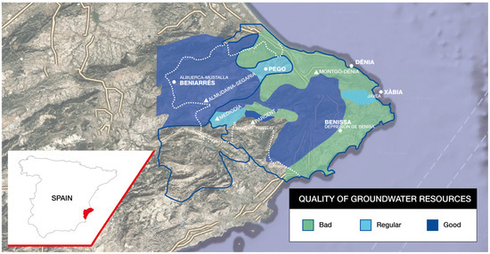 Map of groundwater bodies in La Marina Alta district classified by quality. Source: own elaboration from CHJ [26].