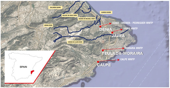Map of WWTPs and surface watercourses in La Marina Alta. Source: own elaboration from [14].