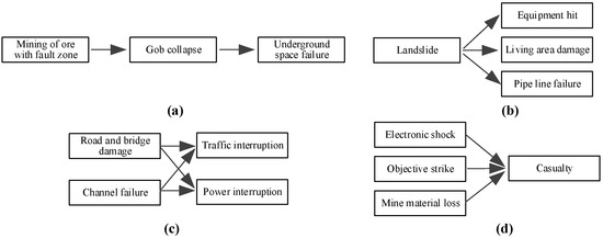 As these primary disasters occur, they can further trigger secondary disasters by impacting various types of disaster carriers, resulting in different types of disasters. These disaster carriers include surface industrial sites, mining facilities and equipment, infrastructure, surface ecological systems, and groundwater systems. For example, damage to infrastructure may result in power interruption (H24), communication interruption (H25), and traffic disruption (H27). Furthermore, these disruptions lead to various forms of damage, including property loss, casualty, and ecological destruction.