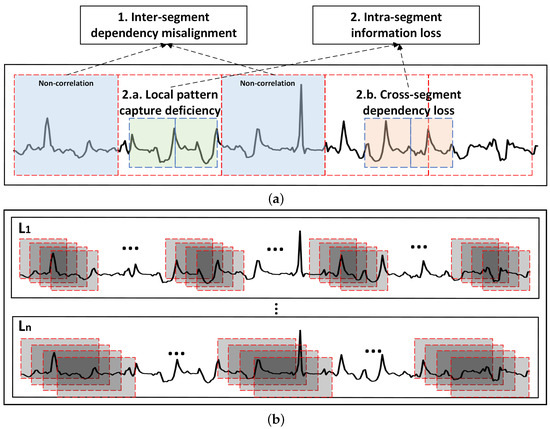However, existing studies employing the patch/segment-based approach with either a fixed segmentation length, a non-overlapping segmentation strategy, or both for local temporal information extraction face several challenges, as shown in Figure 1a. Overall, there are two main shortcomings: inter-segment dependency misalignment and intra-segment information loss. Inter-segment dependency misalignment, as illustrated in Figure 1a, (1) refers to the lack of correlation or misalignment between different segments or patches. Non-overlapping segmentation with fixed length may cause the partitioned segments (i.e., the red dashed boxes) to be less correlated, leading to local temporal dependencies being captured ineffectively. For instance, a segment spanning 9:00 AM to 12:00 PM may show weak correlation with its neighboring segment from 12:00 PM to 3:00 PM, illustrating inter-segment dependency misalignment, where related patterns across segments are not captured effectively.