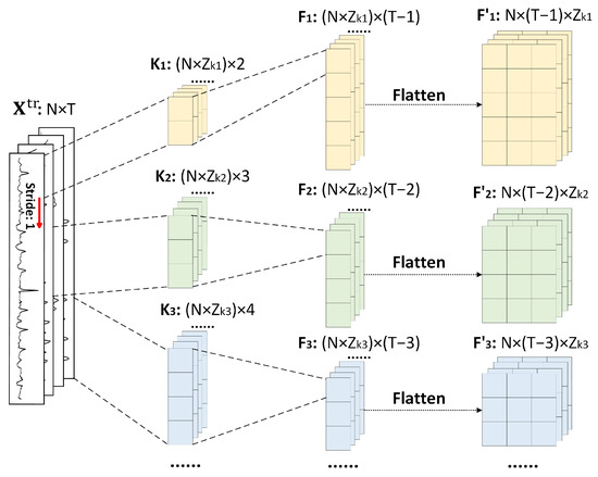 As shown in Figure 4, 1D convolutional filters of varying sizes are applied across the MTS data, with a stride of one. Specifically, a kernel size represented as enables the model to integrate information across a 2-h span, while a kernel extends this to 3 h, and so on. The underlying idea is that larger kernels have the potential to integrate information over more extended temporal intervals, thus capturing longer local temporal dependencies. The approach is designed to capture local dependencies and extract features from different temporal contexts within the time series. Consequently, the convolutional process is expected to yield feature maps of various dimensions. Given the transposed input MTS data , the convolutional operation can be formulated as follows: