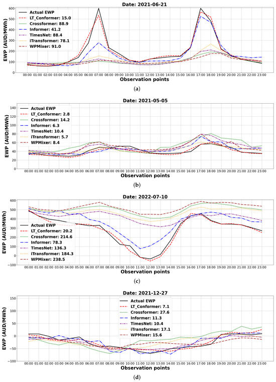 The performance of all methods was evaluated using MAE, RMSE, and SMAPE in NSW and SA, as shown in Table 2. Overall, the LT-Conformer model consistently outperforms the other forecasting methods in both regions, demonstrating minimal error across all evaluated metrics. To evaluate whether the performance improvements of the LT-Conformer are statistically significant compared with all selected models, we conduct paired t-tests at the 0.05 significance level using the MAE. The results in Table 2 show that the LT-Conformer significantly outperforms all compared methods across both regions, with all corresponding p-values below 0.001. Although the MAE difference between the LT-Conformer and Informer is smaller than that with other models, the LT-Conformer achieves consistently lower errors across most samples in NSW, resulting in a larger t-statistic. Figure 6 highlights model performance on selected days in NSW and SA with both high and low EWP variability. These example cases were chosen because they are broadly representative of the observed trends on days with high and low variations for each state. The figure shows that LT-Conformer more accurately tracks EWP values, even in the presence of price spikes. As noted in Figure 6a,c, the LT-Conformer model (represented by the dashed red line) closely tracks the actual EWP values (solid black line), demonstrating its ability to accurately capture the fluctuations and spikes in the EWP. It is worth noting that the Informer model (represented by the dash-dot blue line) also exhibits some ability to track the actual EWP patterns. Other models exhibit larger deviations from the actual EWP values, particularly during the peak hours of the day. While there are some deviations, the LT-Conformer model can capture both positive and negative actual EWP values more accurately than the other models, closely following the rise and fall of prices throughout the day. In Figure 6b,d, the actual EWP data show a relatively flat trend without large variations across the whole day. The LT-Conformer model also achieves superior results compared with the other SOTA methods. These results demonstrate the adaptability of LT-Conformer in forecasting EWP and accurately tracking actual data, whether it shows large fluctuations or remains relatively steady.