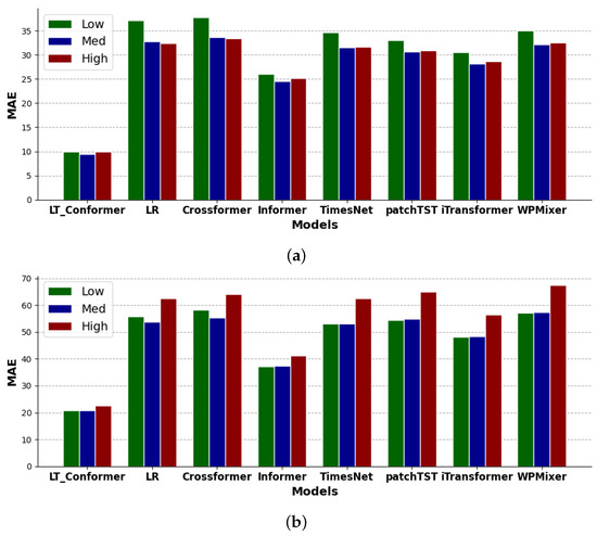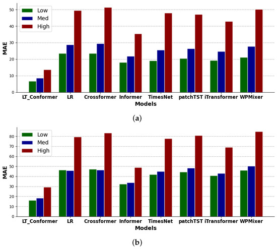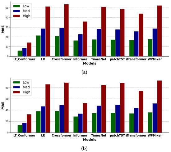 The performance of the models across the defined ranges in both EWP values and EWP volatility is shown in Figure 7 and Figure 8, while the corresponding results for REG values and REG volatility are presented in Figure 9 and Figure 10. The LT-Conformer model exhibits the lowest MAE values across all three categories under diverse market conditions and renewable output scenarios in both regions, demonstrating its forecasting performance and adaptability.