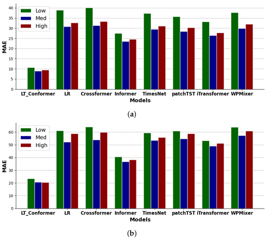 In terms of levels of EWP and REG, the LT-Conformer model demonstrates high forecasting accuracy under low EWP values, corresponding to market conditions such as off-peak times with low GLD [18,19], and under low REG values, which typically occur at night for solar or during periods of low wind conditions. As EWP and REG values increase to medium levels, the model continues to perform effectively, adapting to the standard market dynamics characterized by a balanced supply-demand scenario, while also maintaining accuracy under medium REG values associated with typical daytime renewable output. In high EWP and REG value scenarios, the model adapts well to periods of price spikes as well as peak solar or wind output.