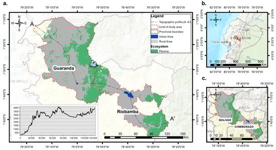 Geographical location of study areas in the central Ecuadorian Andes: (a) Guaranda and Riobamba; (b) Ecuador; (c) Chimborazo and Bolívar.
