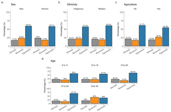 Distribution of dominant environmental concern profiles across sociodemographic categories in Riobamba: (a) sex (male, female); (b) ethnicity (indigenous, mestizo); (c) agricultural involvement (yes, no); (d) age groups (6–11, 12–18, 19–26, 27–59, and over 59 years).