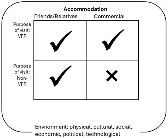 - Backer, E. Opportunities for Commercial Accommodation in VFR. Int. J. Tour. Res. 2010, 12, 334–354. [Google Scholar] [CrossRef]