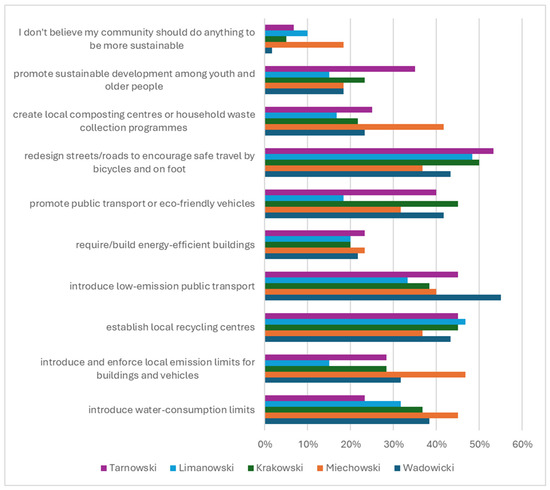 A significant portion of the results is opinions of the rural population on the actions their local communities should take to improve their sustainability. Four statistically significant differences were found (Table 3). The strength of all the effects was low. Only a few answer options were selected by more than 50% of the respondents in individual districts. These were the deployment of low-emission public transport (55% in the Wadowicki District) and the redesign of roads/streets to encourage safe cycling and walking as methods of travelling (50% in the Krakowski District and about 53% in the Tarnowski District). The respondents were not as fond of water-consumption limits (45% in the Miechowski District), introduction and enforcement of local emission limits for buildings and vehicles (nearly 47% in the Miechowski District), or the promotion of public transport or eco-friendly vehicles (45% in the Krakowski District). The answer concerning establishing local recycling centres is a category in and of itself because it was appreciated in all districts except the Miechowski District. In the other districts, it was selected by 43% in the Wadowicki District to nearly 47% in the Limanowski District. Apparently, the promotion of sustainable development among youth and older people was the least important to the respondents (from a mere 15% in the Limanowski District to 35% in the Tarnowski District). Note that over 18% of respondents from the Miechowski District did not believe their community should do anything to be more sustainable. In the Wadowicki District, this answer was chosen by less than 2% (Table 3, Figure 1).