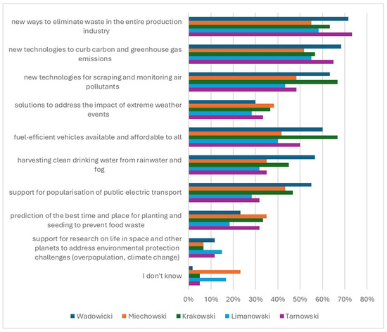 The representatives of rural southeastern Poland were asked to indicate specific environmental-protection and sustainable-development activities that should be prioritised for the public in the five years to come in order to determine their attitude towards the issues investigated in the study. Four statistically significant differences were found (Table 4). The strength of all the effects was low. The respondents seem to have considered the development of new methods for waste elimination in production the most important (over 73% of answers in the Tarnowski District and nearly 72% in the Wadowicki District). Furthermore, they considered it necessary to develop new technologies to curb carbon and GHG emissions (over 68% of answers in the Wadowicki District and 65% in the Tarnowski District) and new technologies for scraping and monitoring air pollutants (about 67% in the Krakowski District and 63% in the Wadowicki District). Moreover, nearly 67% of the respondents in the Krakowski District and 60% in the Wadowicki District indicated the need to make fuel-efficient vehicles available and affordable to all. Notably, almost 57% of the respondents from the Wadowicki District believed harvesting clean drinking water from rainwater and fog to be important in the future. The importance of the creation of solutions to address the impact of extreme weather events ranged from about 28% of the respondents from the Limanowski District up to about 38% in the Miechowski District. The share of the answer concerning support for research on life in space and other planets to address environmental protection challenges (such as overpopulation and climate change) is interesting. It was selected mainly by the Limanowski District population (15%) and the Wadowicki District and the Tarnowski District (about 12% each). Nearly a quarter of the respondents from the Miechowski District chose ‘I don’t know’, while in the Wadowicki District, it was less than 2% (Table 4, Figure 2).